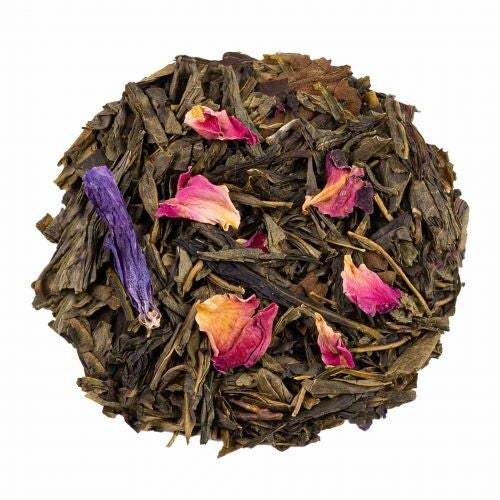 Ingrédients: thé vert China Sencha, thé blanc Mao Feng, thé blanc Pai Mu Tan, arôme, China Jasmin Dragon Pearls, pétales de rose, lavande, arôme naturel de mauve et lavande.