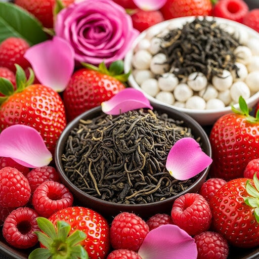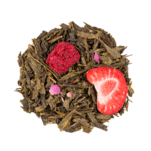 Ingrédients: Thé vert China Sencha, arôme naturel de fraise, China White Monkey, fraise, framboise, arôme naturel de framboise, pétales de rose, China Jasmin Dragon Pearls.