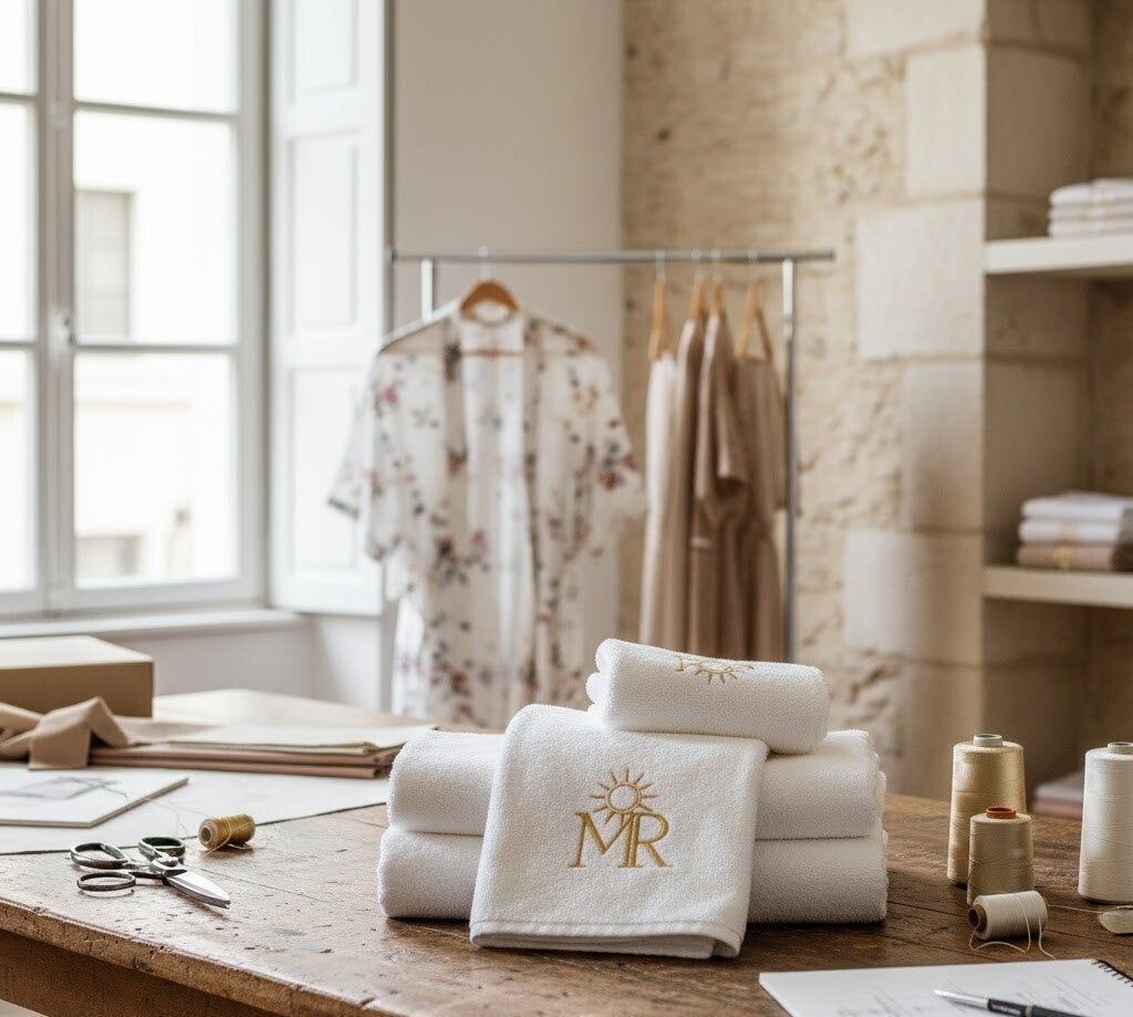 Service de broderie personnalisée MFR sur linge de maison haut de gamme et serviettes de bain monogrammées à Bordeaux.